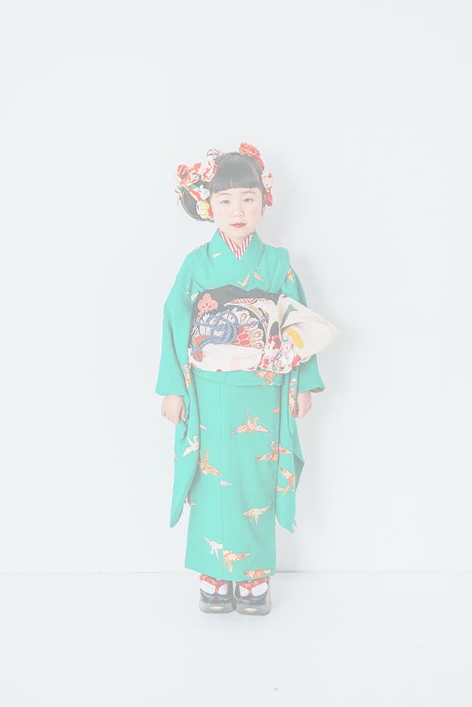 000/緑に折り鶴/110-120cm(裄56丈118)/アンティーク・絹/状態○/
