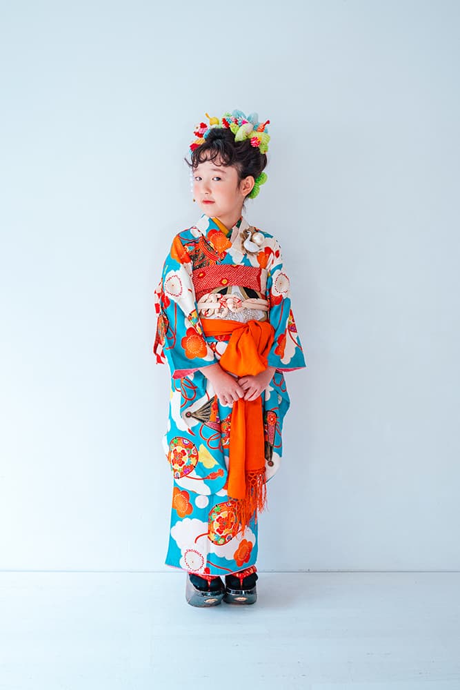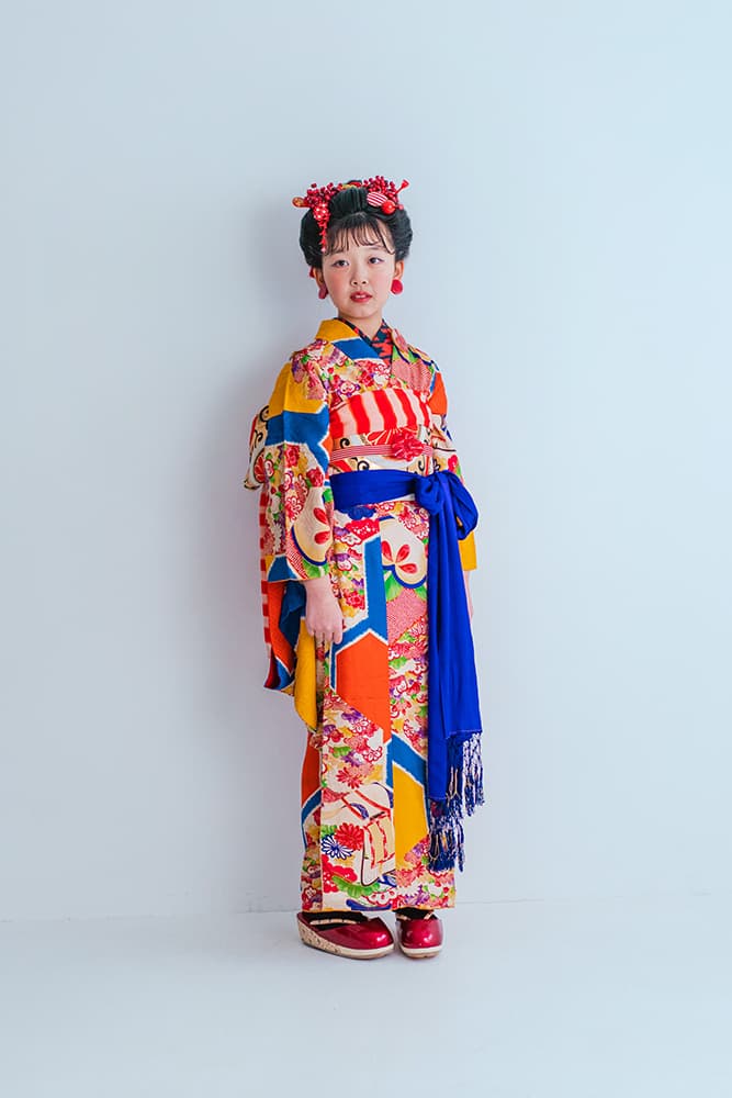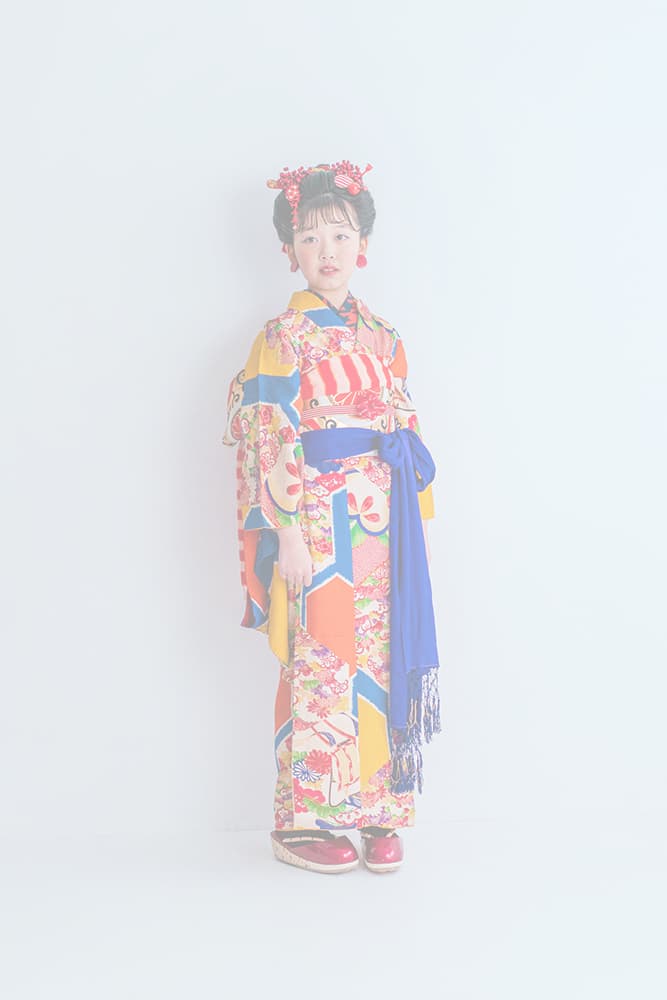 000/橙と青の大亀甲/130-140cm(裄57丈143)/アンティーク・絹/状態○/