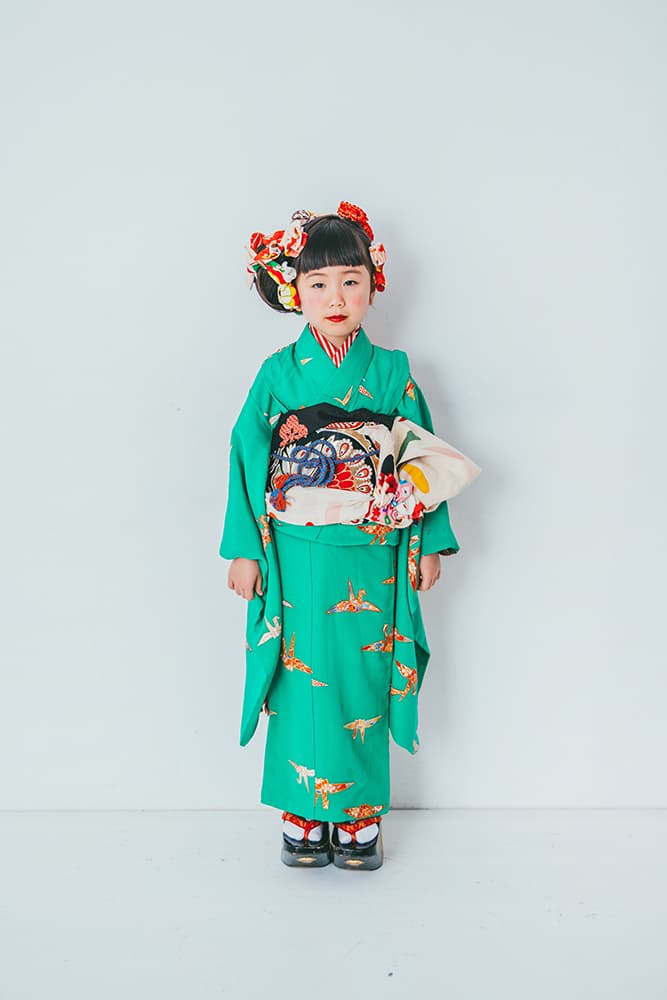 000/緑に折り鶴/110-120cm(裄56丈118)/アンティーク・絹/状態○/