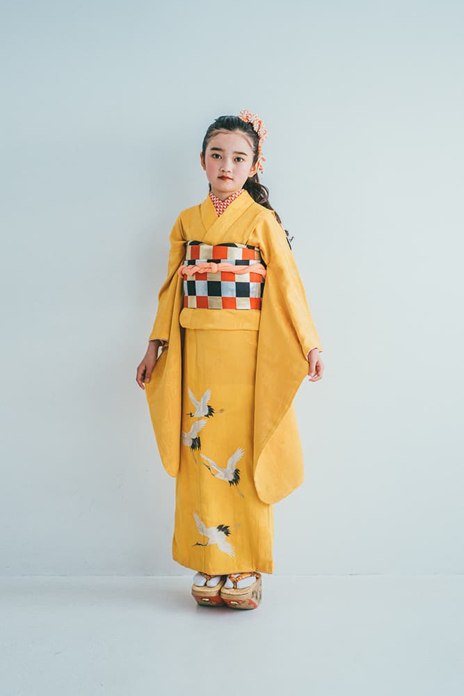 000/橙に虹鶴・双子/110-120cm(裄58丈118)/アンティーク・絹/状態◎/