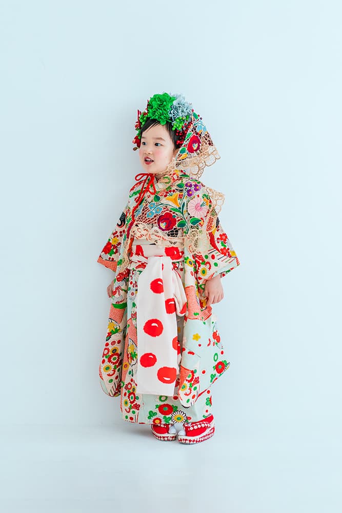 000/赤に白い菊々3歳/96-106cm(裄48丈106)/アンティーク・絹/状態△/